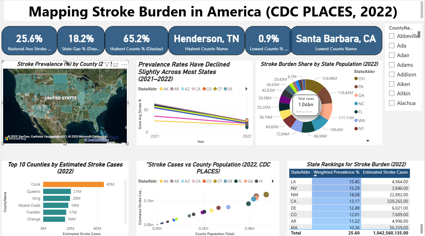 I believe dashboards should do more than just show numbers they should tell a story. Using Power BI, Tableau, and R, I design visuals that bring clarity to complex data and make decision-making easier. One of my favorite projects was mapping stroke burden across U.S. counties, where a simple dashboard helped highlight the region's most in need of attention. For me, the magic happens when data becomes so clear that anyone from a manager to a community leader can say, “Now I get it.”