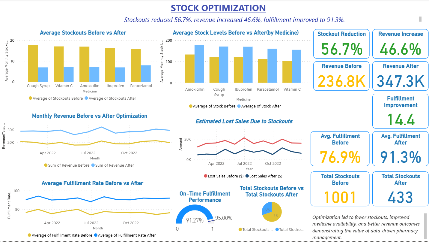 This dashboard highlights the impact of a pharmacy system optimization I designed to improve inventory and supply chain efficiency. The project reduced medicine stockouts by 56.7%, increased revenue by 46.6%, and improved fulfillment rates from 76.9% to 91.3%. It also shows how data-driven insights prevented lost sales and ensured consistent medicine availability for patients.