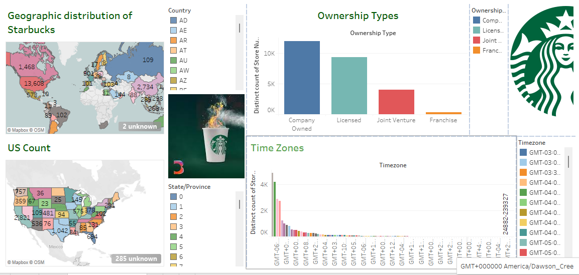 Starbucks has evolved into one of the most recognizable brands worldwide, and my Tableau dashboard explores the data behind its impressive global footprint. The dashboard visualizes store distribution, ownership models, and presence across regions and time zones. It highlights how Starbucks has expanded beyond the United States into key international markets such as China, Japan, and Canada. Within the U.S., it breaks down store counts by state, revealing regional hotspots and areas with slower growth. Another layer of insight comes from analyzing ownership types, showing that licensed stores account for much of Starbucks’ international growth a strategy that allows the brand to adapt to local markets. Time zone analysis further underscores Starbucks’ presence across nearly every major region globally. Together, these insights tell the story of Starbucks’ growth strategy and provide data-driven context for market entry, franchising, and operations management decisions.